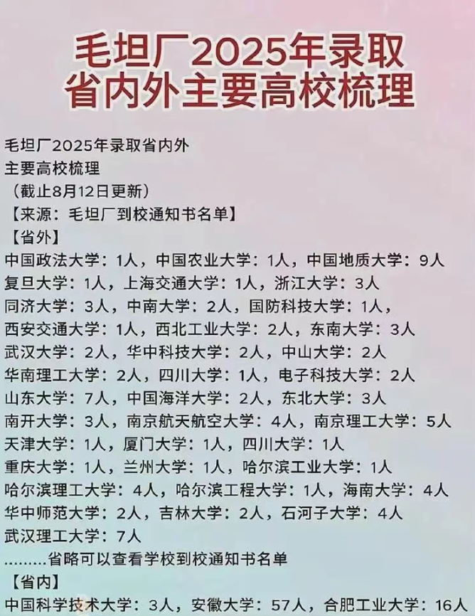 但是无论对哪所高中,网友们关注的不是它的规模,而是它能培养出多少能够考上清华北大的学生。一份疑似是2025年毛坦厂中学复读生的录取数据被网友公开,结果却让人深感意外,这批学生考上清北的人数是0人。