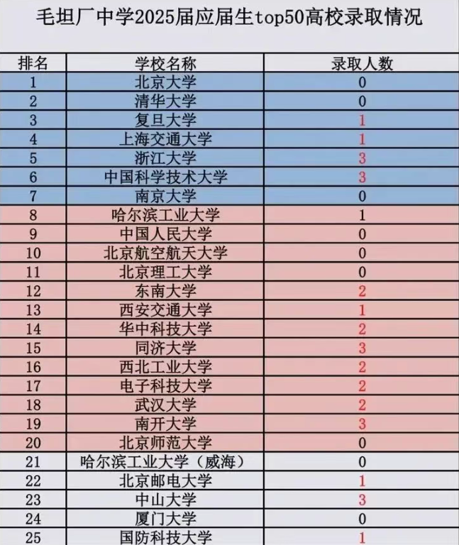 但是让人感慨的是,在2025年两所学校的高考录取数据都出现了较大幅度的下滑,衡中通过高考考入清华北大的人数降了非常多,而毛坦厂更惨,一分疑似为该校的录取数据被公开了,竟然没有人考入清华和北大。