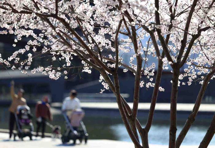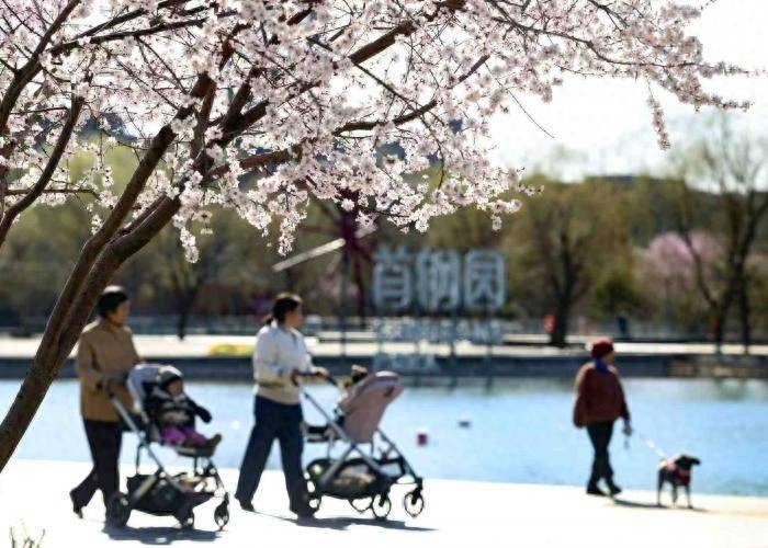 北京首钢园三高炉秀池旁,桃花盛开,游客们在这里踏青赏花。